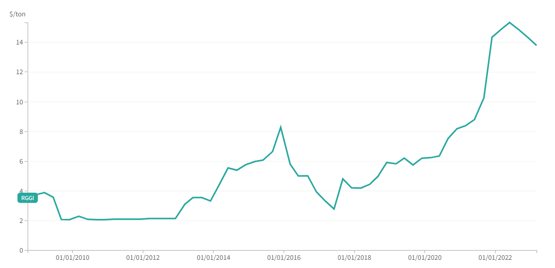 The price of RGGI emission allowances has tripled over the past 5 years to around $15 per tonne. The price has been supported by higher emissions as strong natural gas prices increased demand for thermal coal, risk averse compliance entities in Pennsylvania looked to secure allowances ahead of the state’s entry into the scheme, and a decline in the availability of free emission allowances.