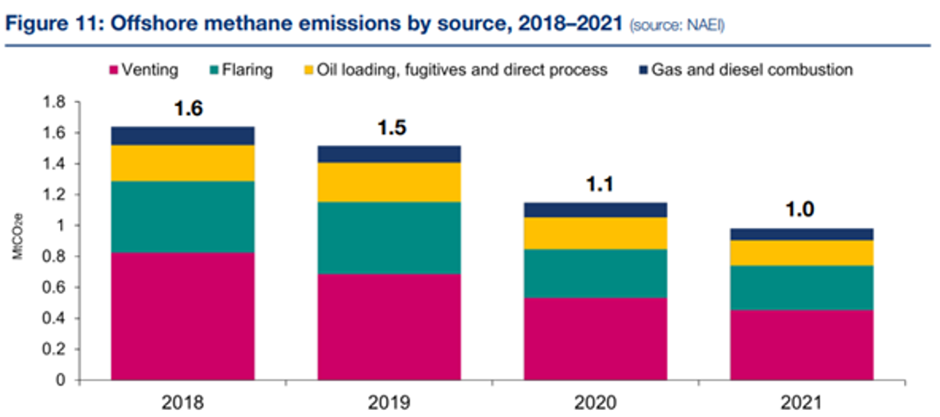 The UK offshore oil and gas industry has made significant progress in cutting its methane emissions. Since 2018 methane emissions have declined by 40% to 0.98 million tonnes of CO2 equivalent in 2021, according to data from the National Atmospheric Emissions Inventory (NAEI).