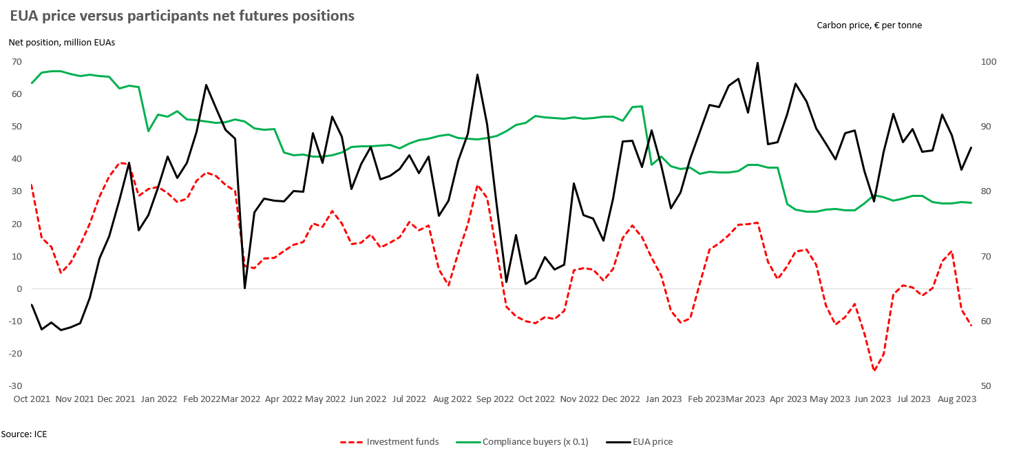 The decline in the net short position was a function of funds cutting their long exposure, while also increasing their short positions. The overall short position is now at its highest level since early June when funds were short 40-44 million EUAs, albeit only for a couple weeks. Putting those two weeks aside and the current short position is the biggest its been since November 2021.