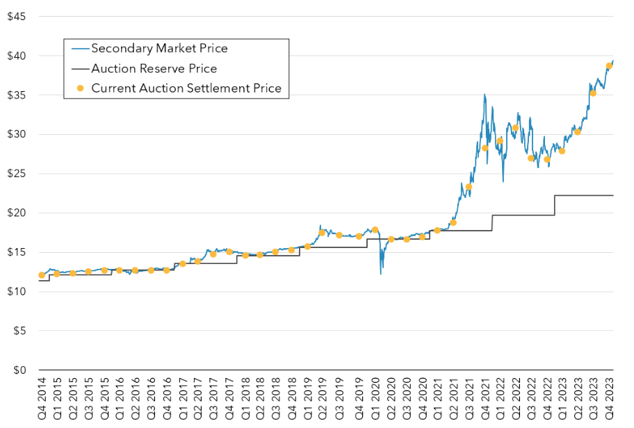 Back then demand at the previous quarterly auction (Q3 2021) was especially strong, clearing at what was then a record 32% premium above the Auction Reserve Price (ARP). An influx of investment fund activity was partly responsible for the surge in demand. Around 30% of the auction volume was sold to investment funds, anticipating that the compliance window was nearing. In response, the CCA futures price jumped from ~$18 per tonne in early 2021 to a high of $35 per tonne in early November. 1