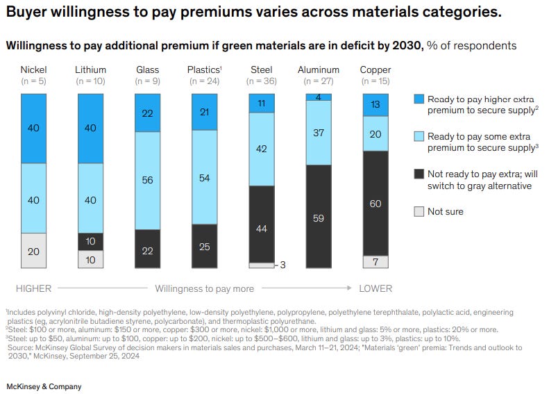 A McKinsey survey of shows growing willingness to pay for green premiums across several materials, including lithium and nickel. Commodity research firm CRU defines the green premium as: “An additional price, over and above that paid for the equivalent ‘standard emissions’ substitute, that the consumer or buyer will pay due to the lower CO2e emissions associated with a product.”