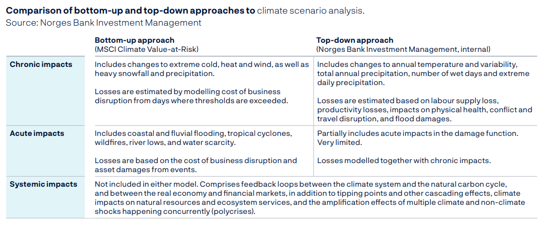 Last year NBIM started to develop a top-down approach to stress test their equity portfolio against an extreme physical climate risk scenario. The modelling estimated the present value of average expected losses from physical climate risk on their US equity investments was 19%, compared to 2% with the MSCI’s bottom-up approach. As the footnote to the table below shows, systemic impacts or parallel economic shocks that could result from negative feedback loops are not included in the estimate of climate risk, so their analysis probably underestimates the downside risks.