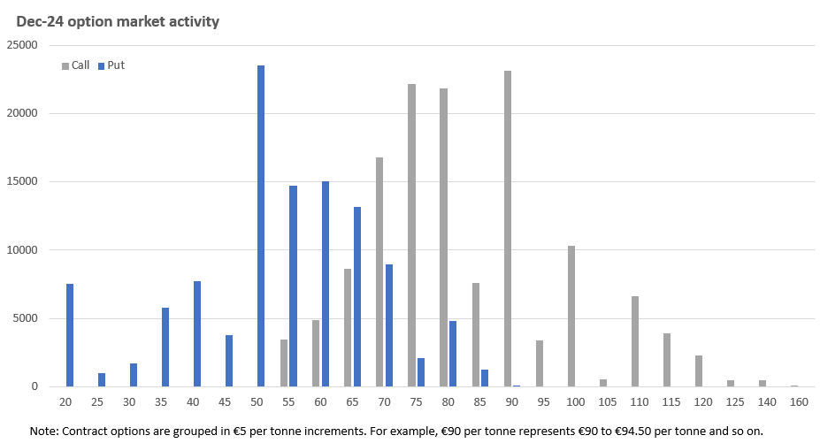 Options market activity exhibits a split in opinion as to where carbon prices might finish the year. The main area activity for December is around the €50 and €90 strike price. However, the overall put-call ratio is 0.81 which tends to point towards a bullish outlook for the EUA price into the year end, coupled with significant call activity at the €70 and €75 level which could offer support (see Escaping the Euro doom loop: A new steady state, the power of narrative economics, and the mispricing of consensus expectations).