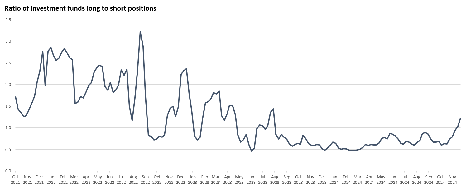 The previous net short position reached a peak of 39 million EUAs during late February, around the time that the EUA price hit a low of €50. The most recent contraction in the net short began in mid-October with funds primarily closing out their short positions. However, since the start of November funds have been building up their long positions, perhaps signalling optimism that the EUA price might increase through the rest of the year and into 2025 (see Good green derivatives: A peek beneath the hood of the EU carbon market).