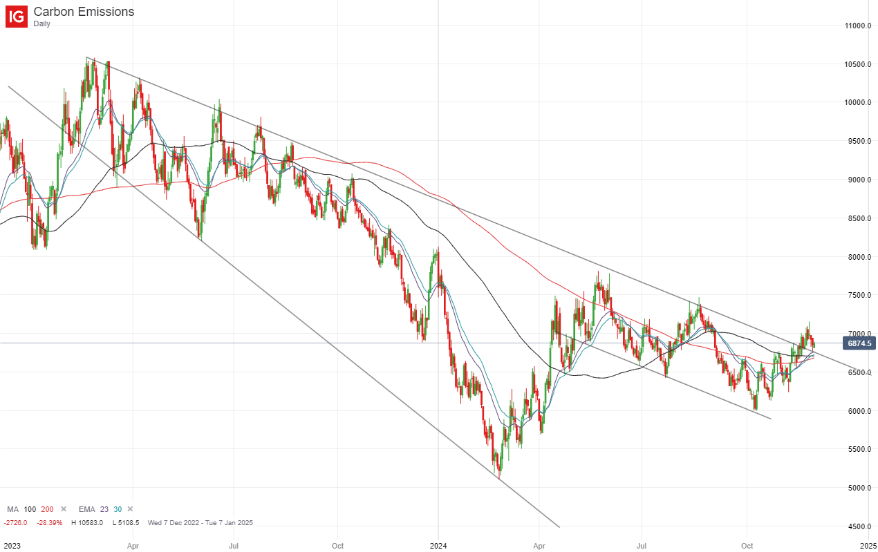 After breaking out of the upper channel (one that’s been in place since early 2023), it looks like the market might be retesting the top of the channel again, checking for support. The 100 and 200 day moving averages (as well as the 23 and 30 day exponential moving averages) are converging on the €67 level and this could also offer strong support at this level. On the other hand, a move below this level might presage a deeper pullback in the carbon price.