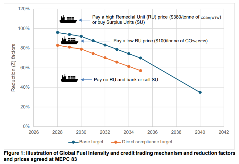 However, if a ship achieves partial compliance (i.e., it cuts its GFI below the base target, but not sufficiently to meet the direct compliance target), then it is deemed to be in Tier 1 compliance deficit. The owner must purchase Remedial Units (RU) equivalent to the deficit multiplied by the price of a Tier 1 RU (starting at $100 per tonne of CO2e). The funds raised from this levy go into the IMO Net Zero Fund, of which more on that later.3