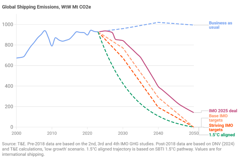 However, even if all ships achieved the direct compliance target it would still fall far short of the IMO’s earlier emission reduction commitment. Recall that back in 2023 IMO member nations agreed to cut shipping emissions by at least 20% compared to 2008 levels by 2030 (striving for 30%), at least 70% by 2040 (striving for 80%), and to reach net zero emissions around 2050. By contrast, the adopted framework focuses on a reduction of at least 8% (base target) and 21% (direct compliance target) by 2030 respectively.