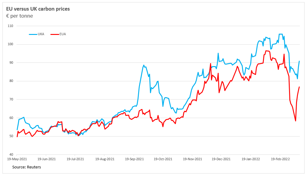 The UK carbon market launched in mid-May 2021. During the first 10 months of trading the price of UK emission allocations (UKA’s) have typically traded at a 10% premium to EU carbon (EUA) futures prices, equivalent to around €7 per tonne.