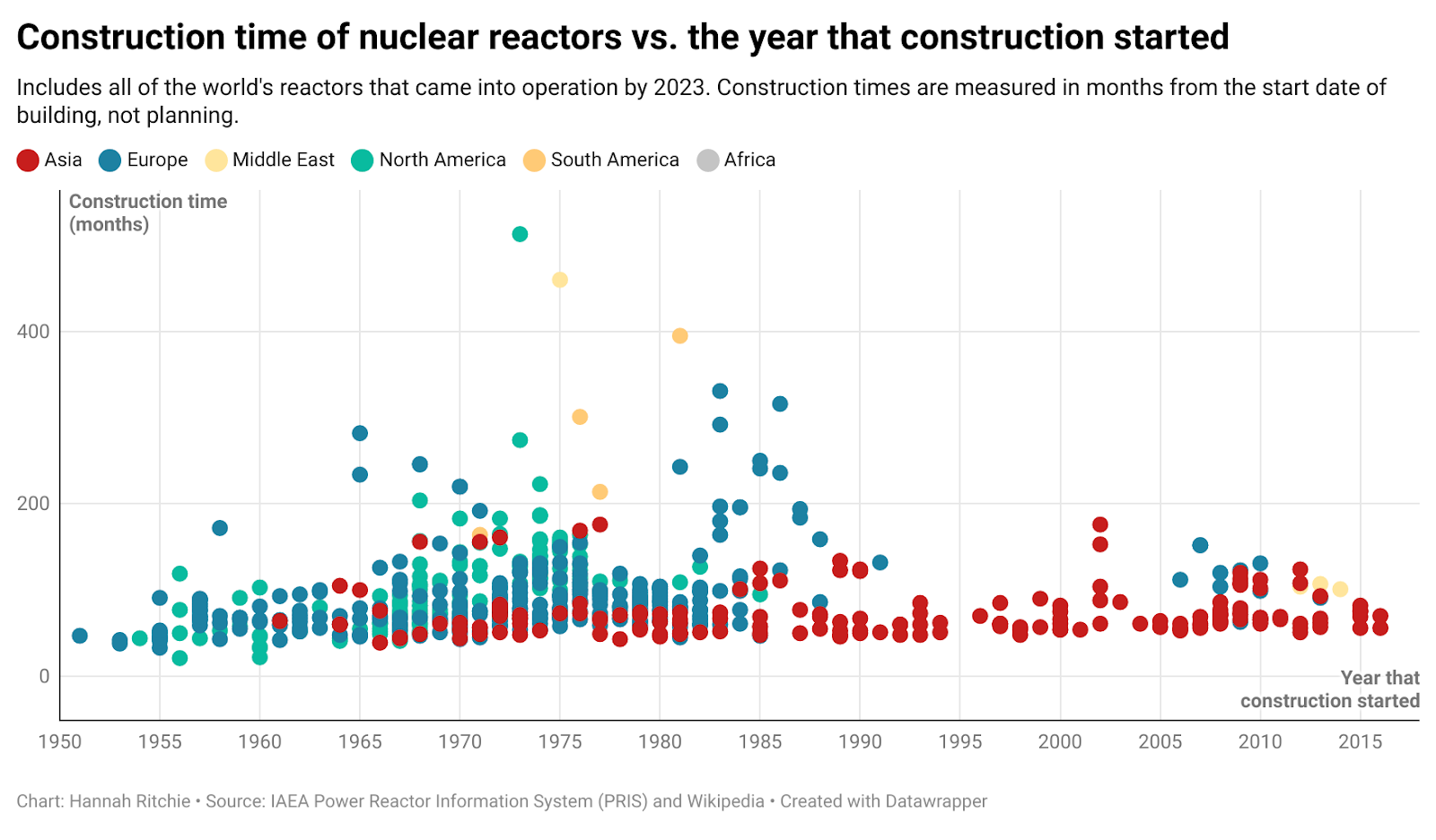 After digging into the construction times of all nuclear reactors across the world since the 1950’s, the author Hannah Ritchie also uncovered an extreme right-skewed distribution. Although some reactors are built in as little as 3-5 years, others take multiple decades to complete. Overall, two-thirds of the reactors built since the 1950’s took less than 8 years between the first laying of concrete to the date that commercial operations began.
