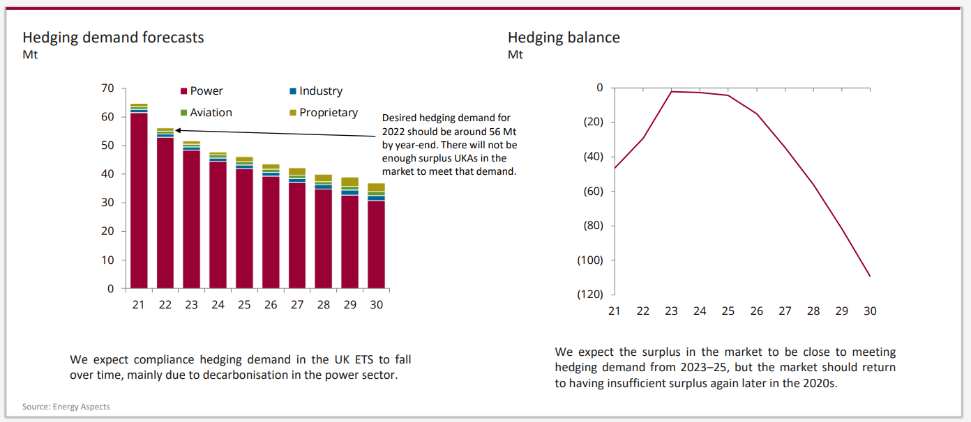 Even though hedging demand is likely to fall as the UK power sector decarbonises, the prospect of a one-off downward adjustment in the emissions cap in 2024, coupled with annual declines thereafter is expected to mean UKAs available for hedging are insufficient to meet demand. This might mean that the UKA-EUA spread balloons out again during the second half of this decade.