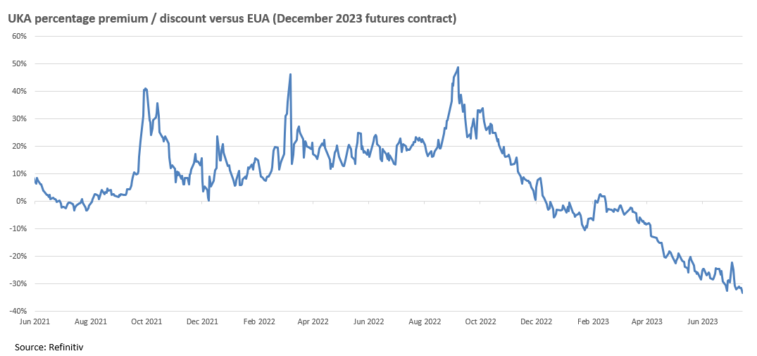 From a peak of around €120 per tonne in late August 2022 (a premium of almost 50% over EUA’s), the price of UKA’s had slumped to €60 per tonne by late June 2023 (a discount of ~33% to EUA’s). Unfortunately, a sequence of poor judgements and weak guidance towards future policy support left the market bereft of credibility.