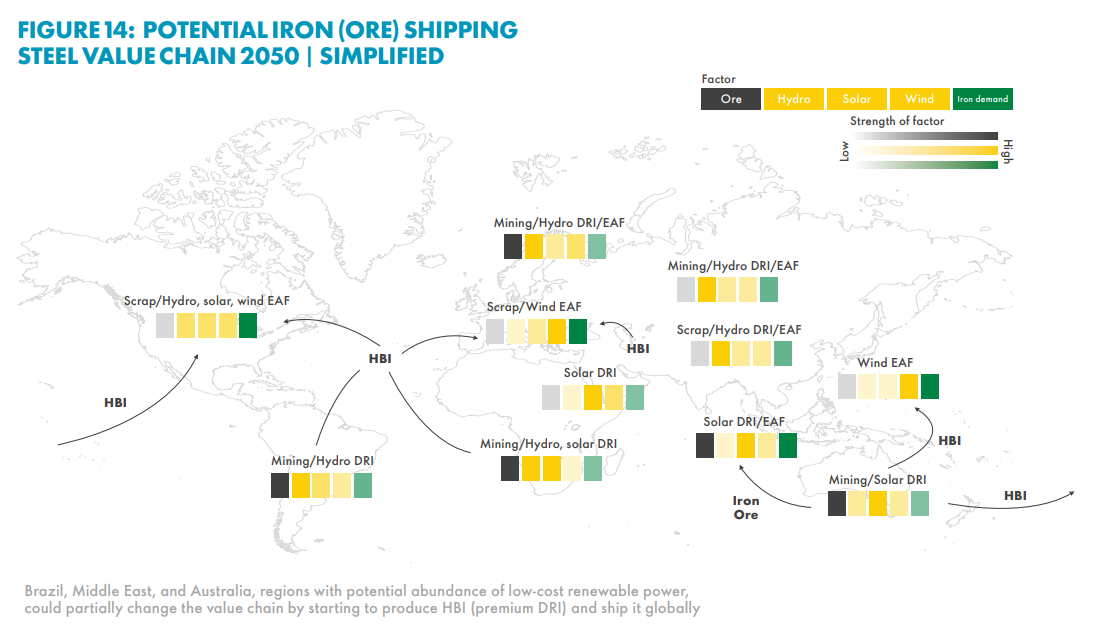 Historically, access to cheap affordable energy has been the main factor in determining the location of steel plants. Even better if there is a rich seam of iron ore lying close by. The latter has become less important over time as iron ore is shipped around the globe. The ore is then processed into DRI at the steel plant.
