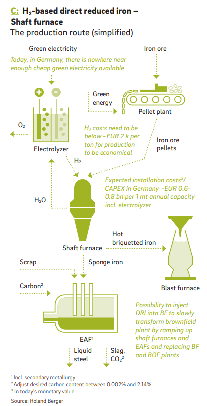 The H-DRI is then fed into an EAF and turned into steel by further processing it and adding carbon. Alternatively, the H-DRI can also be fed into a blast furnace in the form of "hot briquetted iron" (HBI). This significantly increases the efficiency of the blast furnace, reducing the use of coke while avoiding having to do away with the sunk cost of the blast furnace (see Stranded asset, or last mover advantage?).