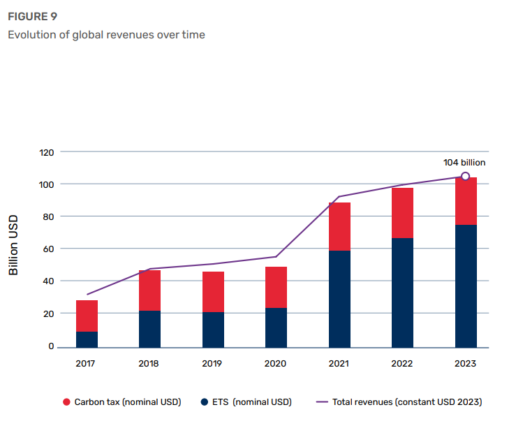 Total carbon pricing revenues exceeded $100 billion for the first time in 2023, according to data compiled by the World Bank. Emission trading schemes (ETS) accounted for over 70% of the revenue generated (of which the EU ETS dominates), supported by the large share of emissions covered by cap-and-trade schemes, and the relatively high carbon prices achieved (see It's the carbon price, stupid!).