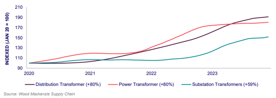 - The lead time for transformers has increased 10-fold since 2020, to around two years, while transformer prices have risen by almost 80%