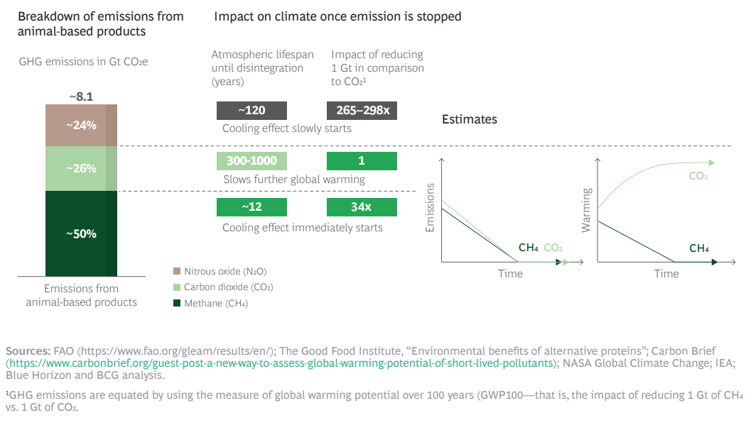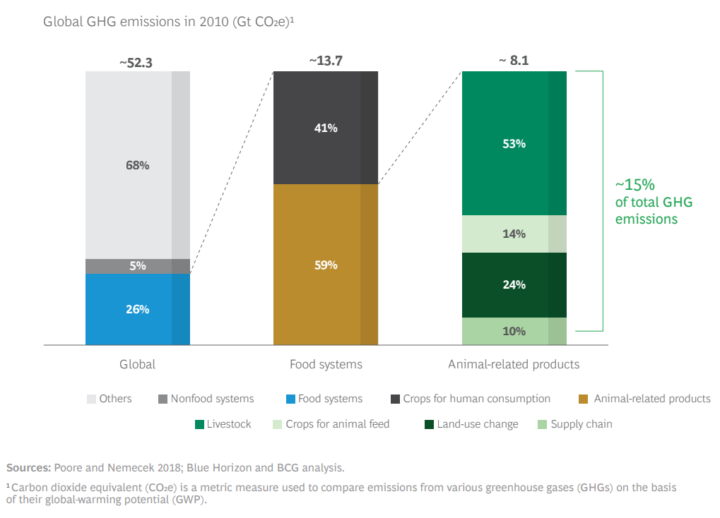 Animal related products are estimated to account for 8.1 Gt CO2e (~15%) of annual global GHG emissions. Livestock account for about half of the emissions, primarily as a result of cattle burping, but also what’s emitted from their manure. The remaining emissions come from activities that support the industry such as the production of animal feed, land-use changes and other supply chain activities.