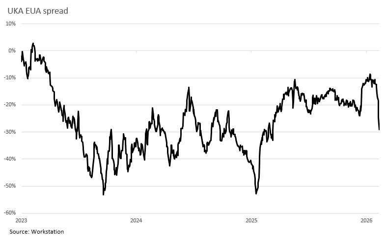 The UKA price had been consistently trading at a ~10% discount to EUAs since the end of 2025. Even after the EUA price fell sharply in late January after it was caught up in the cross-commodity liquidation, the spread remained broadly stable. It has only really begun to widen since last Wednesday (4th February), doubling to almost 30% in one week.